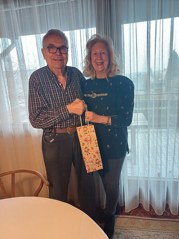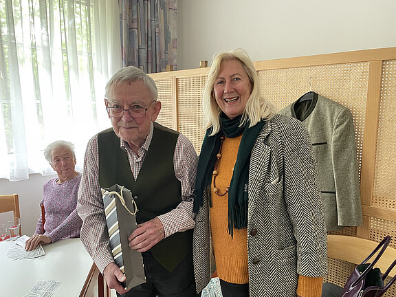 Obfrau Anne Hölzl übermuttelt die herzlichsten Wünsche zum 92. Geburtstag von Herbert Foff.