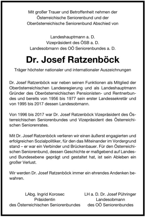 Herr LH d.D. Dr. Josef Ratzenböck ist am 23. Dezember, im 97. Lebensjahr, verstorben wir werden ihn in guter Erinnerung behalten!